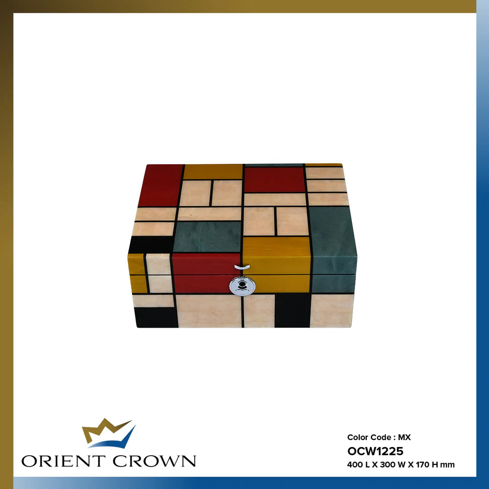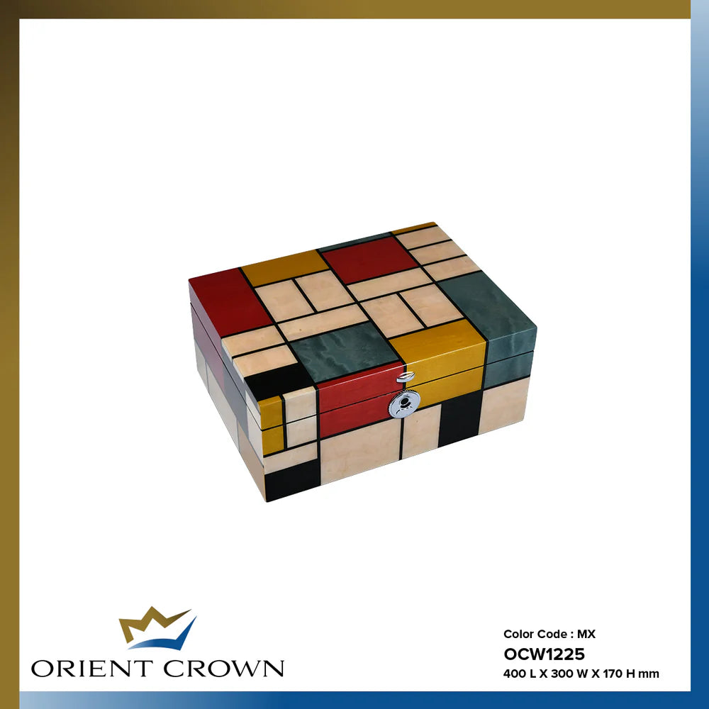 The Orient Crown 15-Cradle Watch Box blends elegance with practicality, offering ample space for a growing collection. Its premium veneer wood exterior is enhanced by a high gloss piano finish in a tasteful mixed-color design, creating a unique and eye-catching display piece.