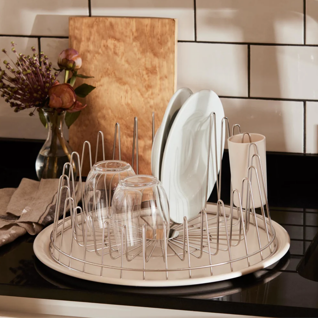 Dish drainer in 18/10 stainless steel with cutlery drainer in thermoplastic resin. This item is part of the “A tempo” family, designed by Pauline Deltour. The objects in the “A Tempo” family play in a crescendo of rhythm, movement, length and density. Working the wire as if it were a graphic element allowed her to highlight its aesthetic qualities, creating an unusual, different language characterised by very special optical effects.