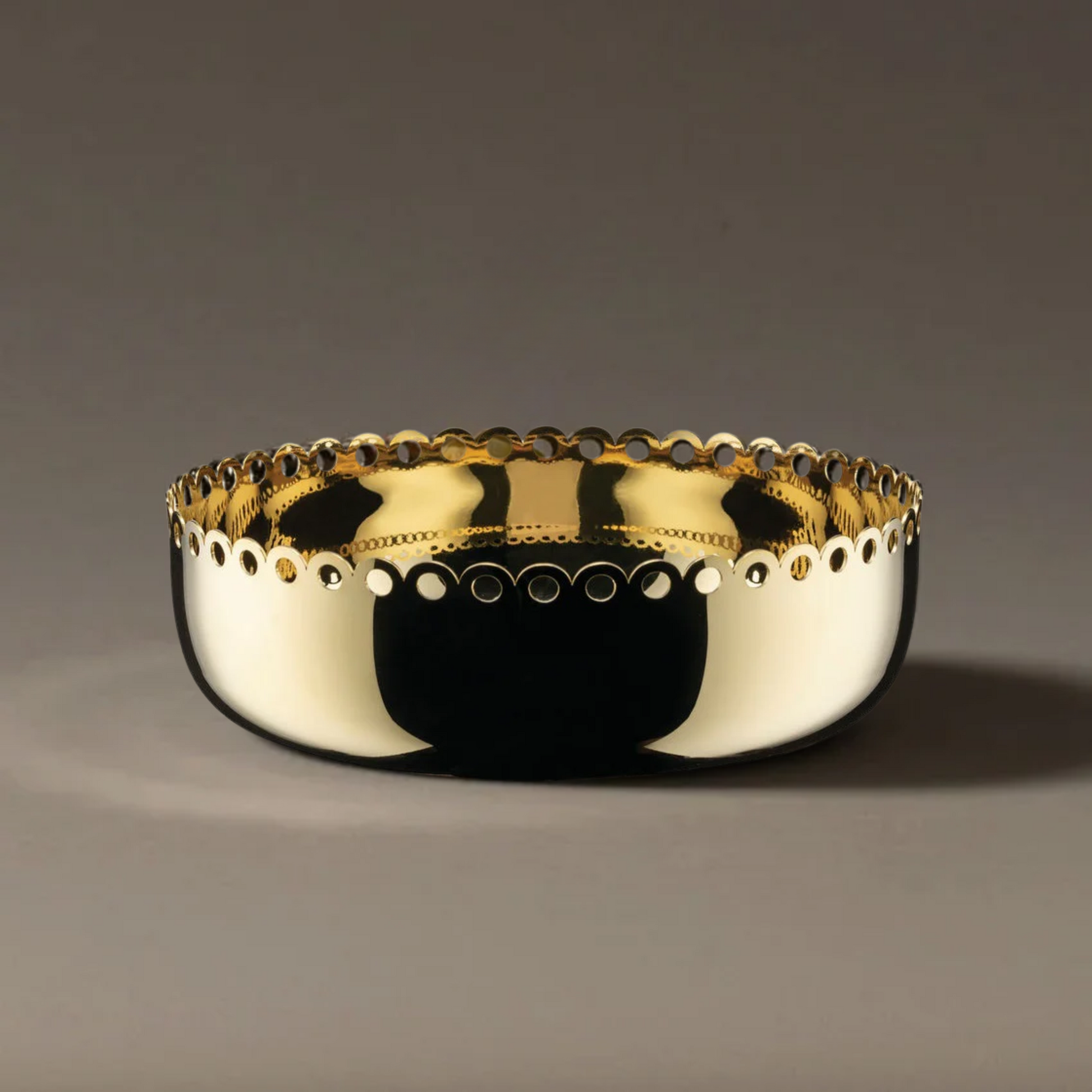 The Edges family is composed of a basket, cake stand, ice bucket and tray, all adorned with delicate edging reminiscent of embroidered trim. Nika Zupanc embraced the iconicity and immediacy of small, perforated holes running along the outer edges of this small collection. Instead of being a decoration for its own sake, it aims to create a direct relationship between us and the items. Although simple and easy to understand, the embellishment is employed to create an instantaneous emotive impact. The objects come in two versions: 18/10 stainless steel, and 18/10 stainless steel with brass PVD coating.
