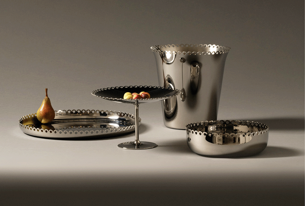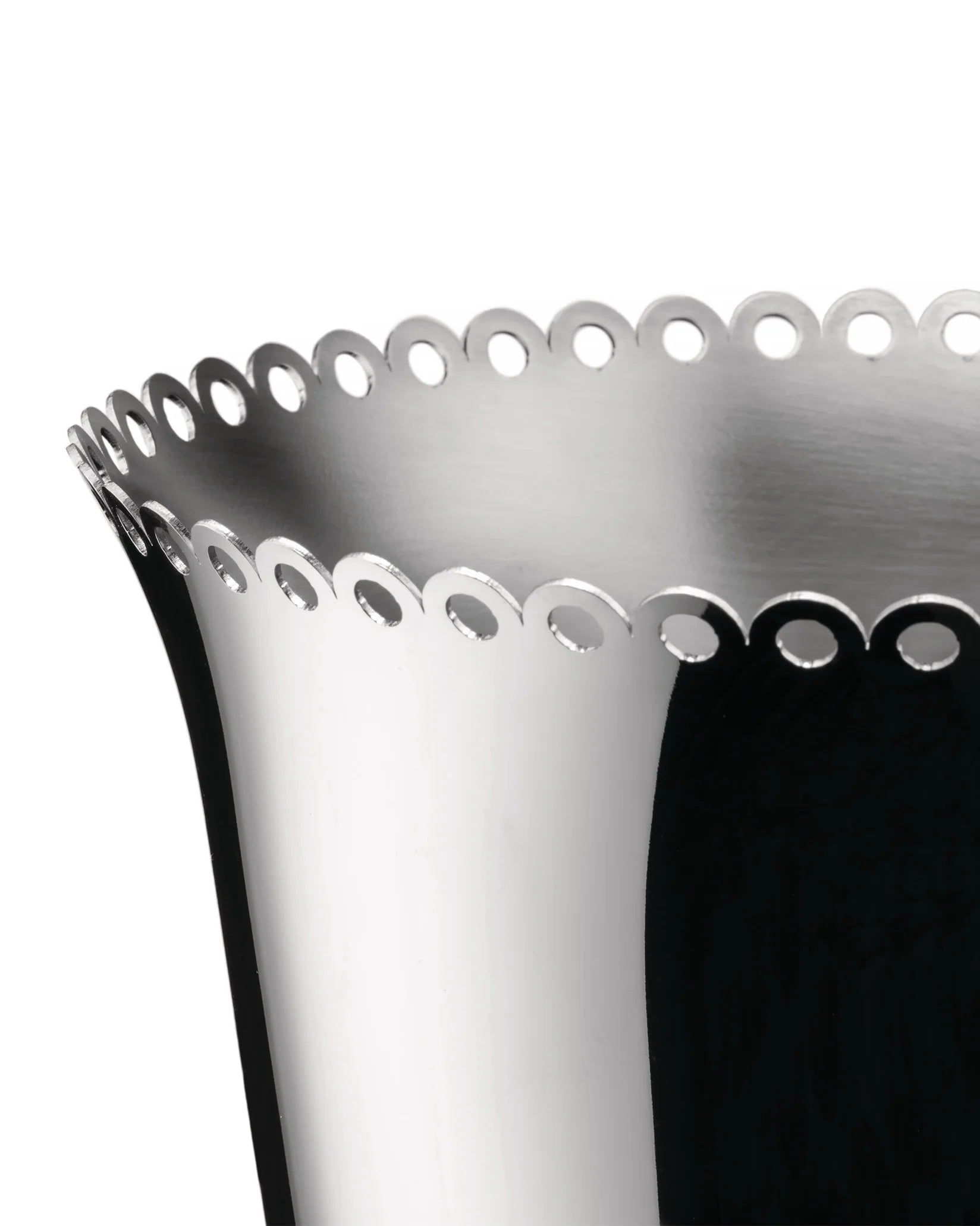 The Edges family is composed of a basket, cake stand, ice bucket and tray, all adorned with delicate edging reminiscent of embroidered trim. Nika Zupanc embraced the iconicity and immediacy of small, perforated holes running along the outer edges of this small collection. Instead of being a decoration for its own sake, it aims to create a direct relationship between us and the items. Although simple and easy to understand, the embellishment is employed to create an instantaneous emotive impact. The objects come in two versions: 18/10 stainless steel, and 18/10 stainless steel with brass PVD coating.
