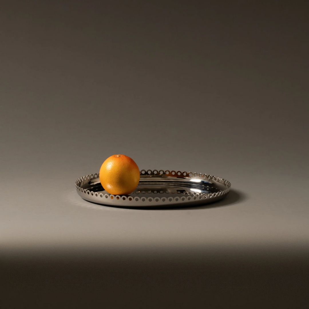 Elevate your hosting game with Alessi's Edges Tray. Featuring delicate scalloped edges and stylish perforation, this polished beauty brings a touch of golden elegance to any occasions. Perfect for those who love their serve warm with a side of sophistication.