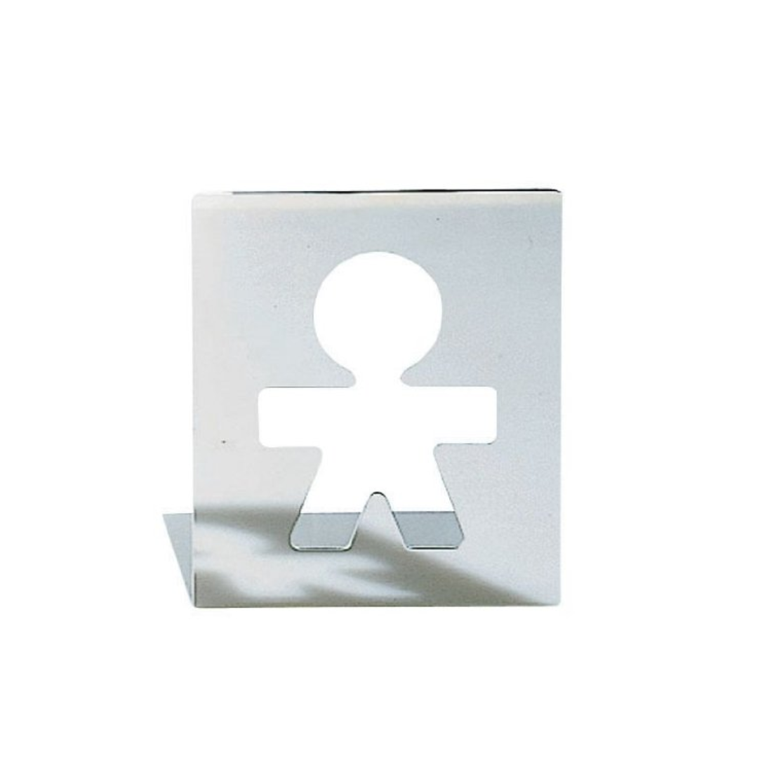 A Girotondo stainless steel bookend from Alessi’s “A di Alessi” line. This contemporary design piece is made from polished stainless steel and features the playful Girotondo motif — a series of iconic perforated figures that are typical of the collection’s whimsical and modern aesthetic. The bookend is both decorative and functional, helping keep books upright while adding a stylish, minimalist accent to shelves or desks.