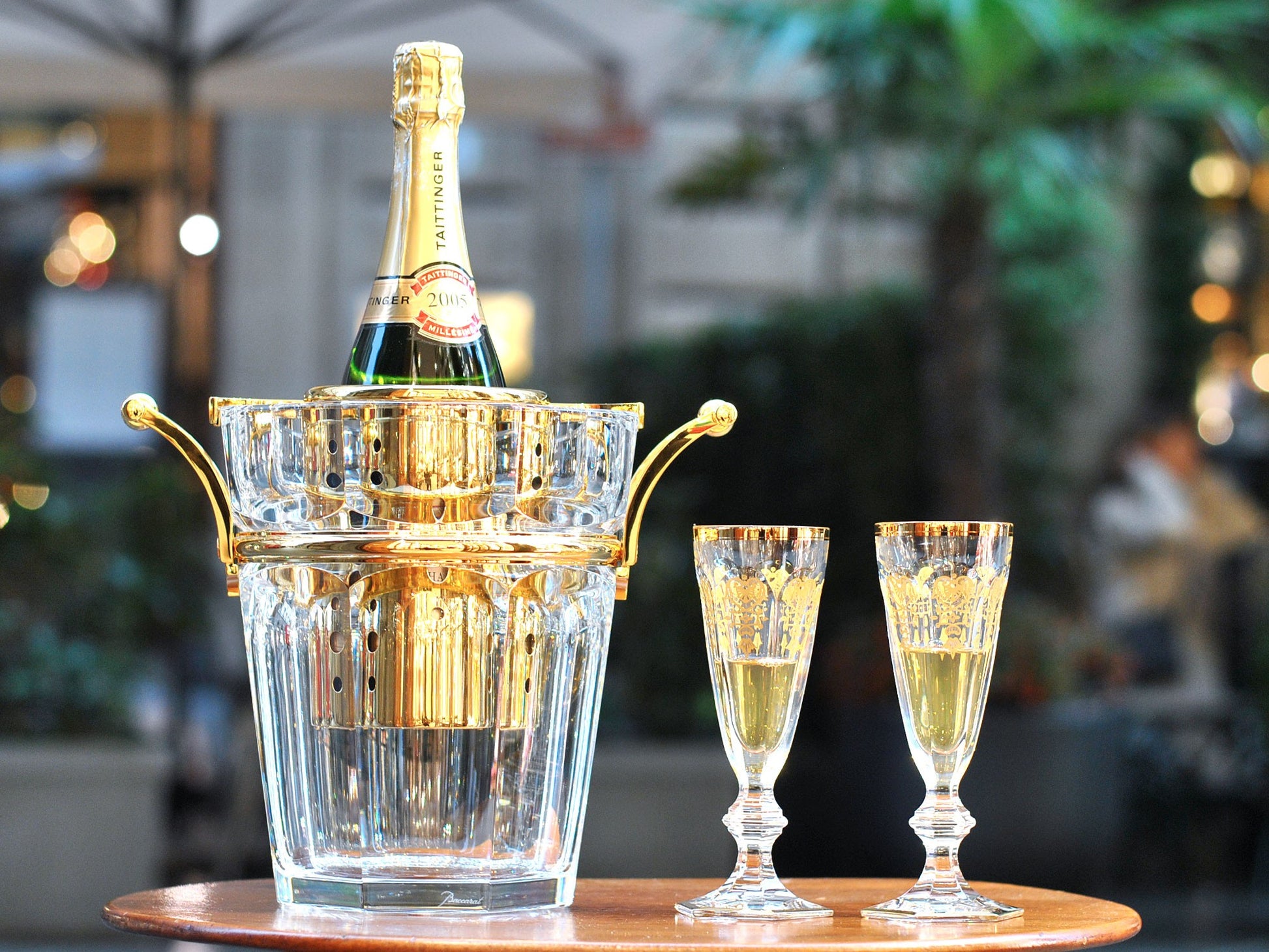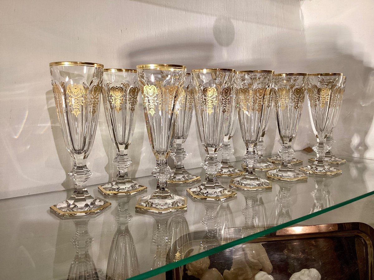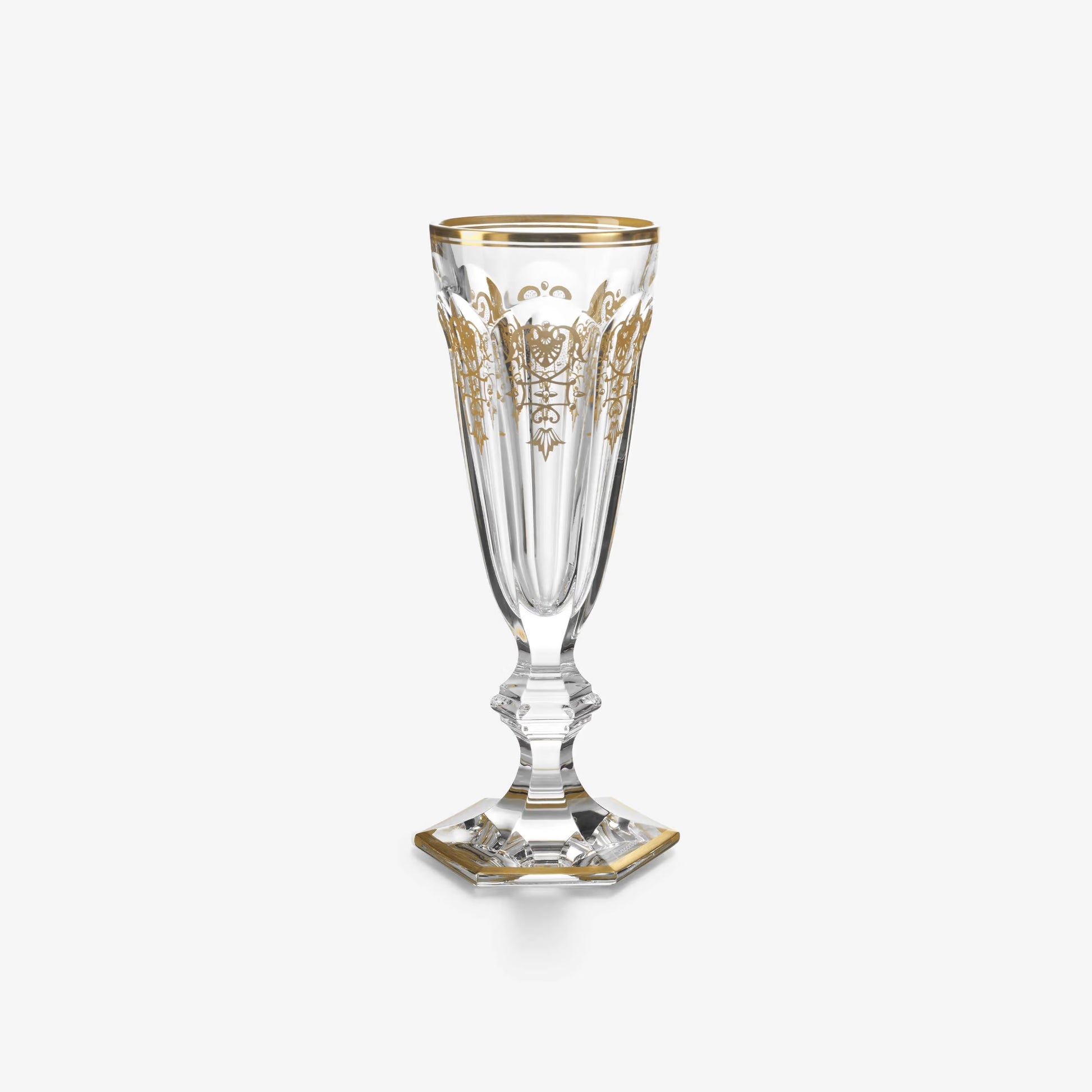The Harcourt Empire champagne flute revisits the Harcourt collection’s regal architectural form. Created in 1841, the Harcourt Empire is the oldest in the Baccarat archive and is reputed for its iconic design. The Harcourt Empire champagne flute shares the same structural outline as the Harcourt champagne flute, but adorned with exquisite golden embellishment. The flat cut pattern of the bowl has golden decorative shapes applied with a light hand, and a gilded ring around the rim. The geometric beveled stem remains classical, while the hexagonal foot is gold-trimmed around its perimeter. The Harcourt Empire collection, sparkling lucid crystal complemented by graceful gold, also includes a wine glass and highball. Baccarat's Rivoli stemware collection has gilded features as well.