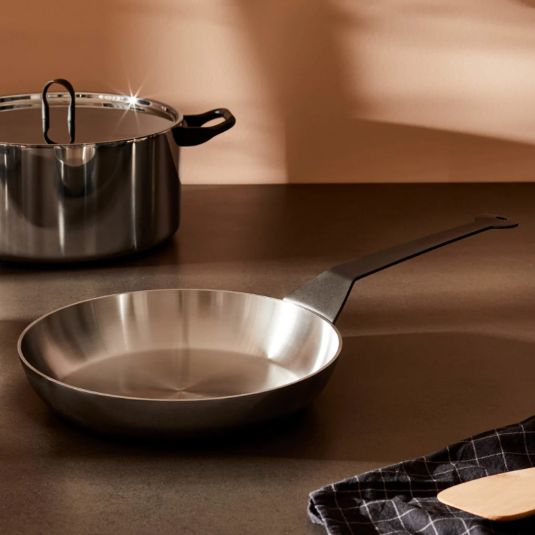 Designed by Richard Sapper, the La Cintura di Orione collection is crafted for passionate cooks seeking professional performance at home. This 24 cm frying pan is made of premium stainless steel with a thick copper base, ensuring fast and even heat distribution. Ideal for searing, frying, and sautéing, it combines functionality with refined design. A timeless piece that brings both precision and elegance to the kitchen.