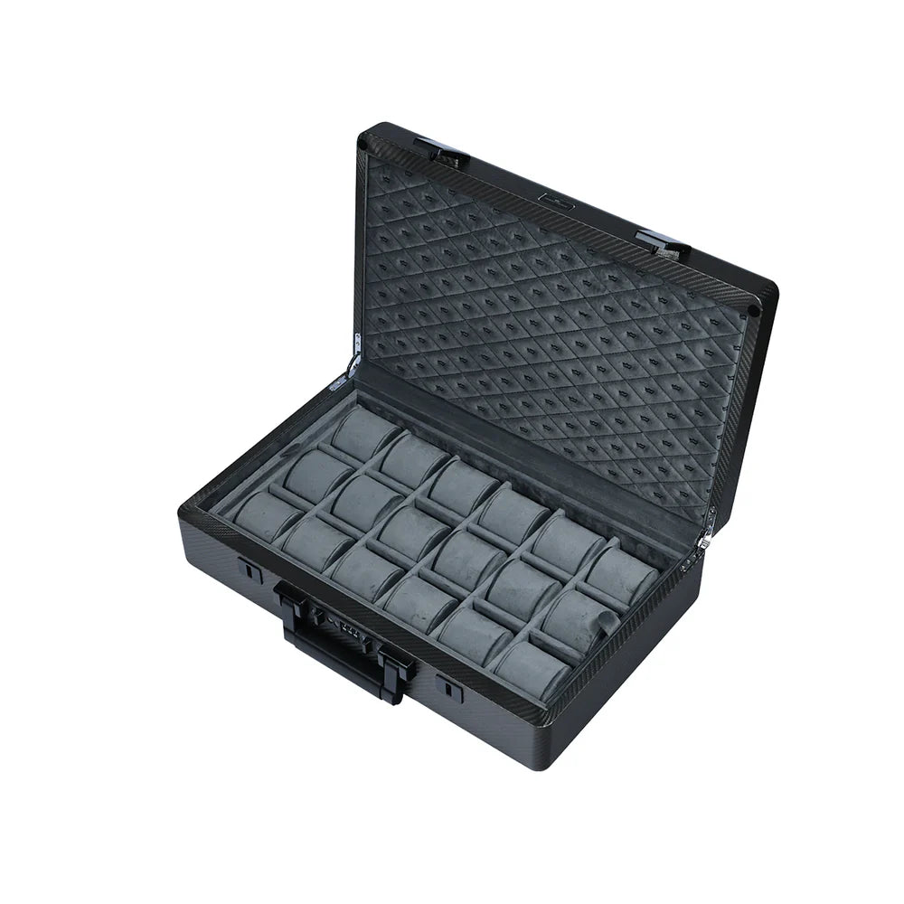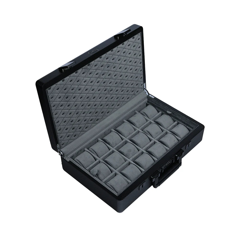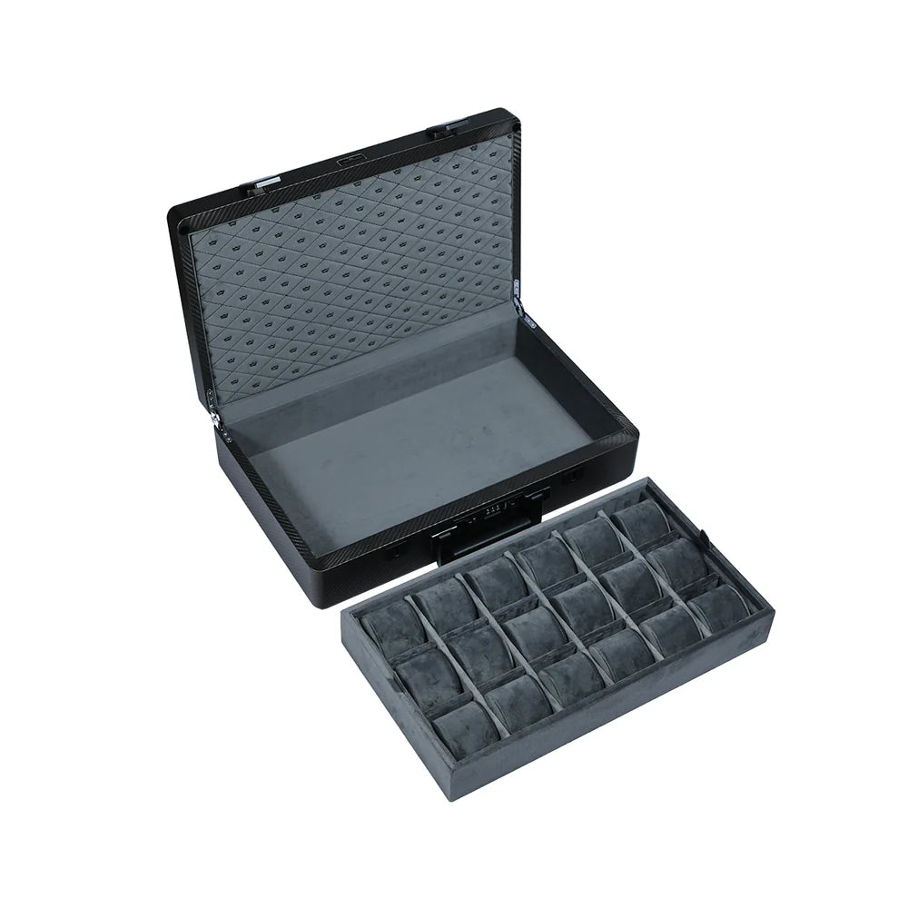 Enter a realm of sophisticated charm with our Watch Briefcase — designed to store up to eighteen of your most valuable timepieces. This ultimate expression of luxury and craftsmanship features a removable inner tray, allowing you to repurpose the briefcase for other storage needs.