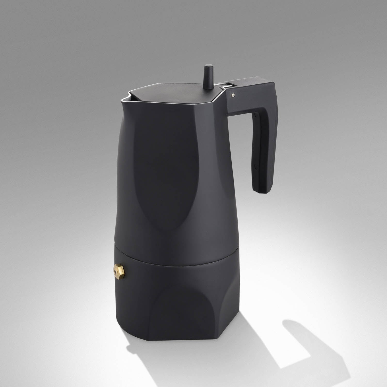 Espresso coffee maker in aluminium casting, black. Handle and knob in thermoplastic resin, black. 3 cups.