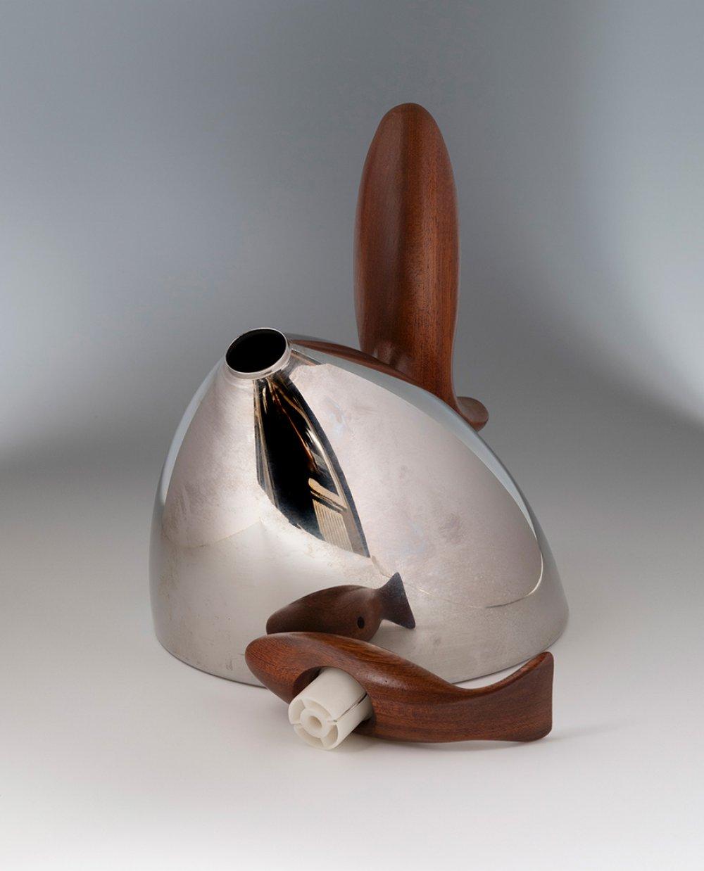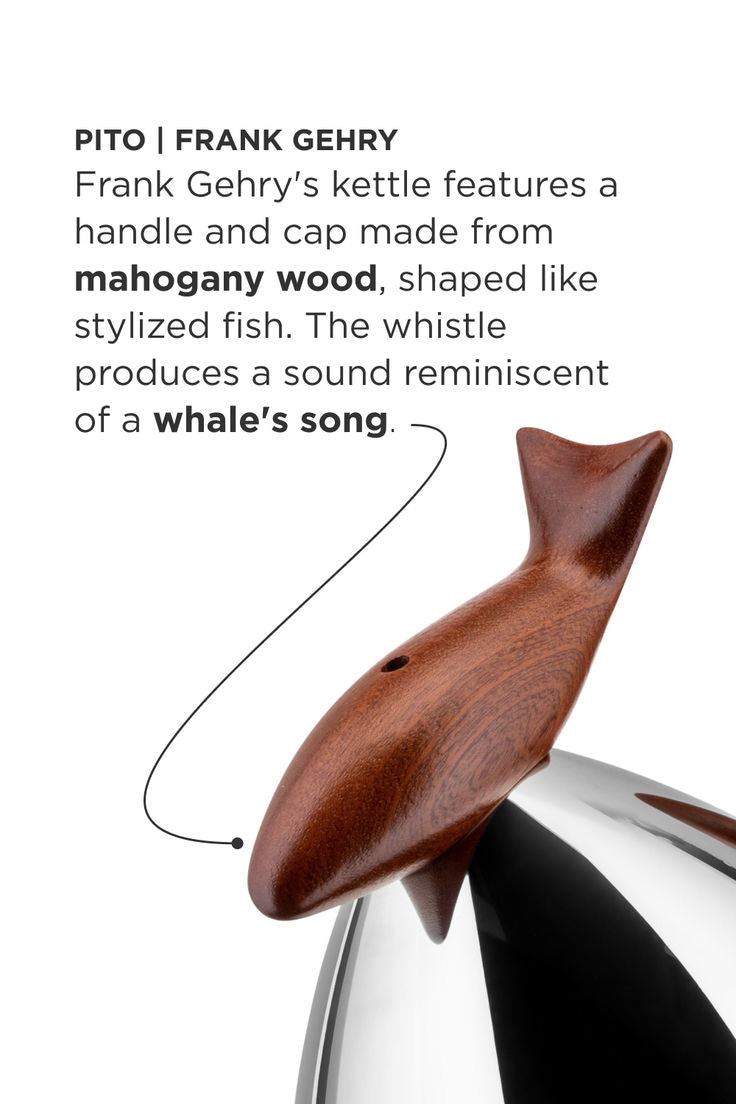 Pito is a stainless steel kettle designed by Frank Gehry. The melodic top and the handle in mahogany have the stylized shape of two darting fishes. The melody produced by the whistle is likewise peculiar, it sounds like a whale's song. Gehry turned a kitchen utensil into a fascinating poetic object.