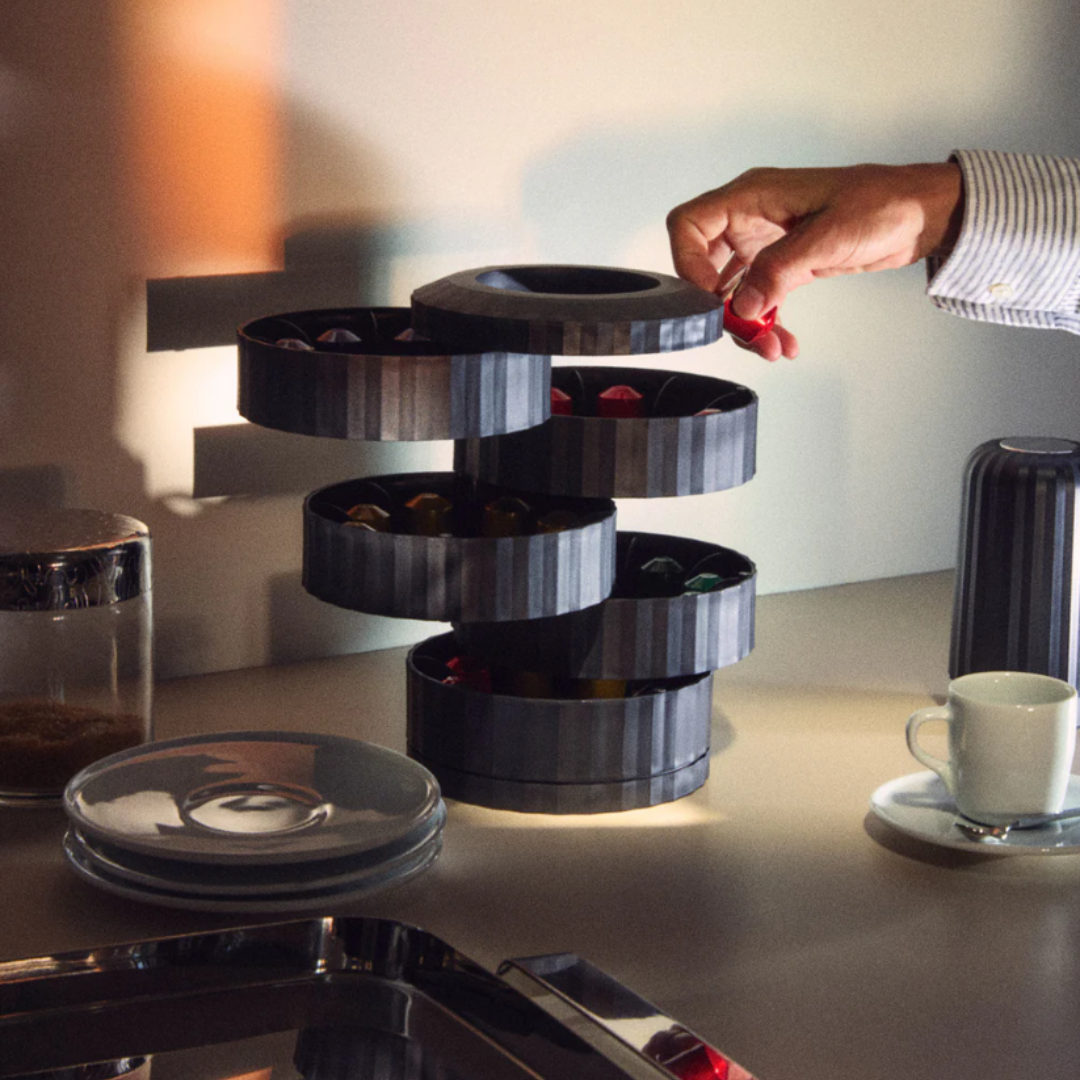 An indispensable accessory for keeping your favourite coffee capsules handy and tidy at all times. This practical container looks like a model of a modern building and leaves no doubt as to its originator: Michele De Lucchi. A functional and fascinating object: the mechanism for opening the five compartments in which the capsules are stored offers a pleasant and somewhat surprising user experience thanks to the playful use of dynamic volumes. Espresso coffee capsule holder with 5 rotating shelves in thermoplastic resin, black. Suitable for holding up to 40 capsules compatible with Nespresso® machines.