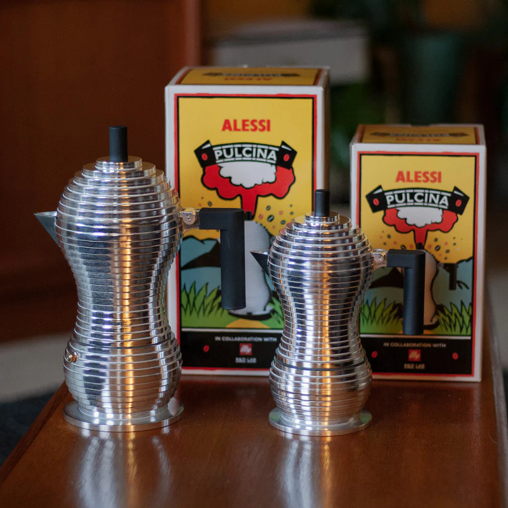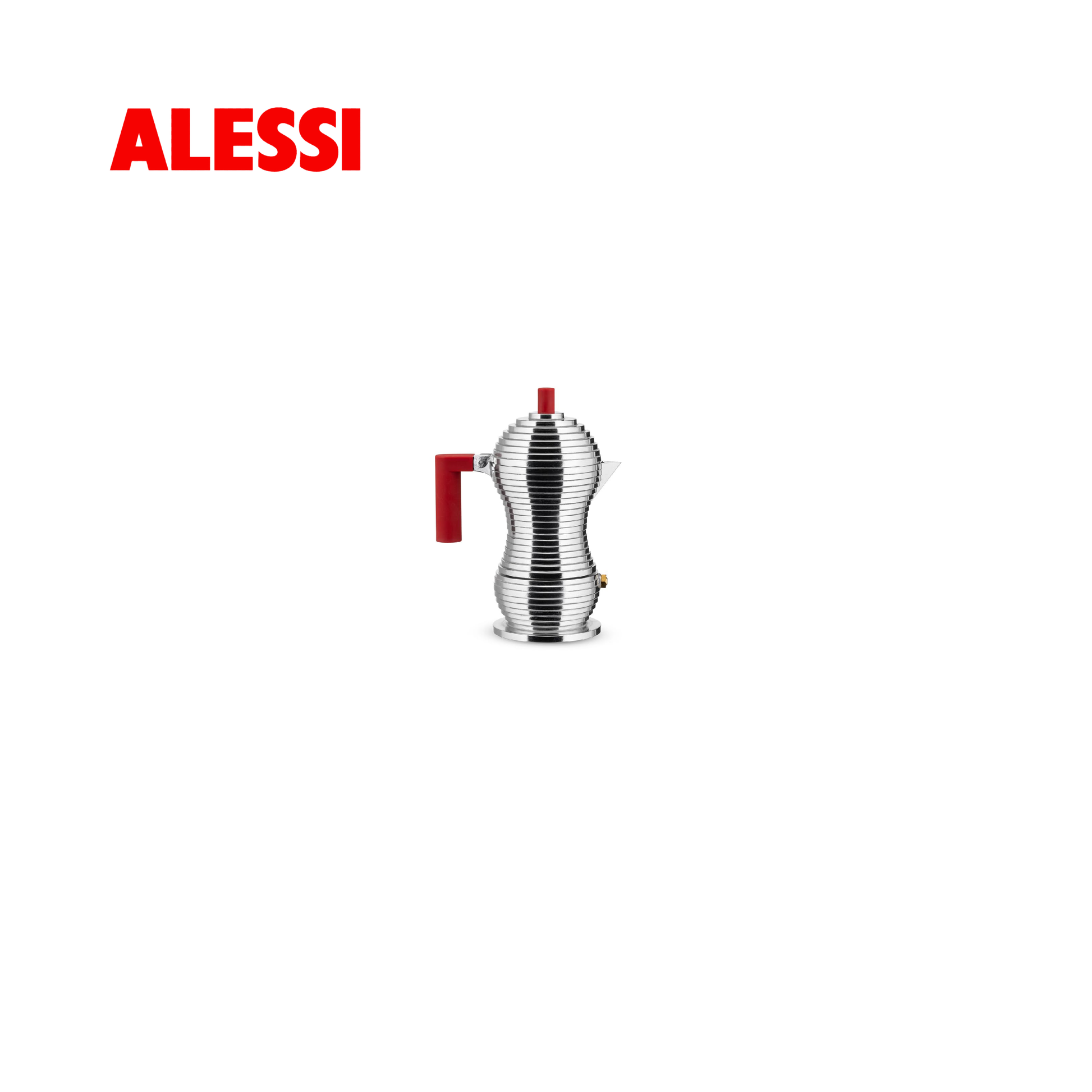 A revolutionary and modern espresso machine that combines the coffee-perfecting technology developed by illycaffè and the design experience of Alessi. Designed by architectural visionary Michele de Lucchi, the Pulcina Espresso Coffee Maker encapsulates a small but substantial design innovation that stops dispensing the drink at the right time before the coffee gets a bitter aftertaste. This helps to enhance the full and rich aroma of your espresso. The spout, which recalls a chick's beak (hence the name of the coffee maker - ""pulcina"" = ""chick"") allows it to perfectly stop the drop. The Alessi Pulcina is an inventive evolution of the traditional coffee pot. Available with black or red handles.