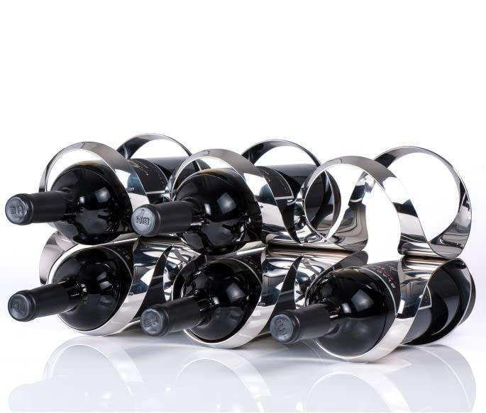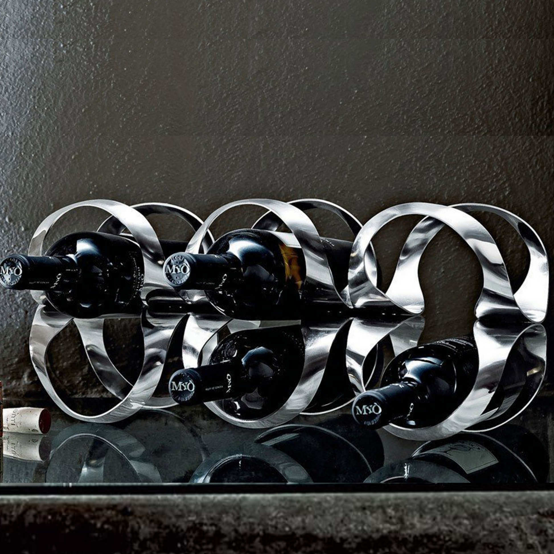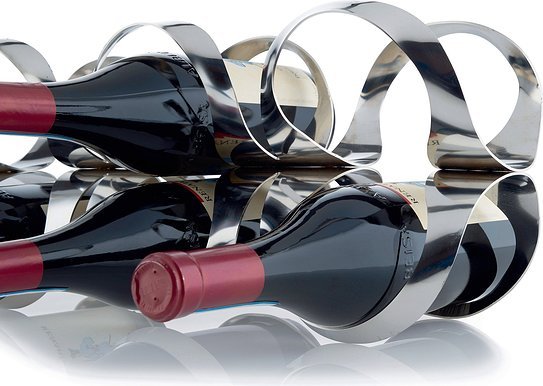 Bottle rack in steel coloured with epoxy resin, Super Black. Ribbon, designed by UNStudio, is like a soft ribbon enveloping the bottles, delicately holding them in the air, offering an original interpretation of the classic kitchen bottle holder. Its unique structure and the expressive power of the design, make it an object that can steal the show, establishing itself as an important kitchen accessory. Ribbon can hold up to six bottles of the most popular styles on the market.