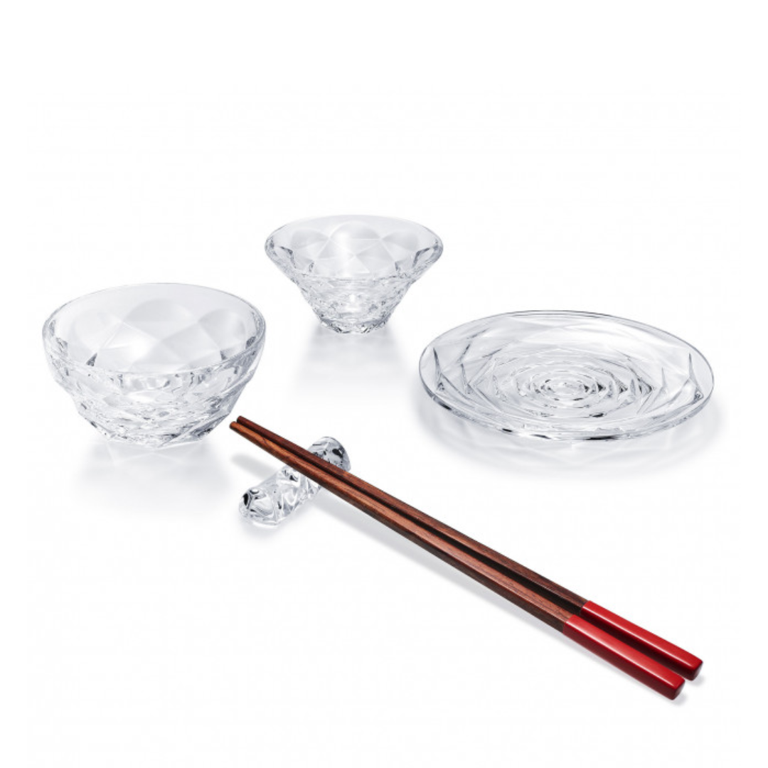 An elegant crystal sushi and Asian dining set from Baccarat, crafted from premium French lead crystal. The “Swing Asian” set includes four pieces typically a chopstick rest, a small plate, a coupelle, and a small bowl designed to serve sushi, dim sum, soy sauce, pickles, and other Asian-style dishes in refined style. Its clear crystal construction showcases Baccarat’s signature brilliance and clarity, making it a luxurious gift for gourmets and lovers of elegant tableware or a standout addition to your tabletop dining presentation.