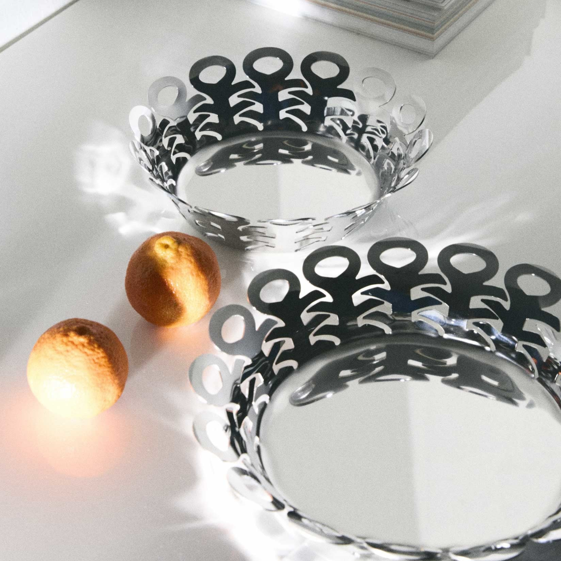 Inspired by traditional, woven wicker baskets, Michel Boucquillon and Donia Maaoui have created a novel and original object that charmingly plays with the shapes of this traditional handcraft. The Vimini basket stands out thanks to its sophisticated design. After being cut with a laser, the sheet steel is molded in a series of mechanical production steps that once again rely on the Alessi workshops' skill to process this metal.